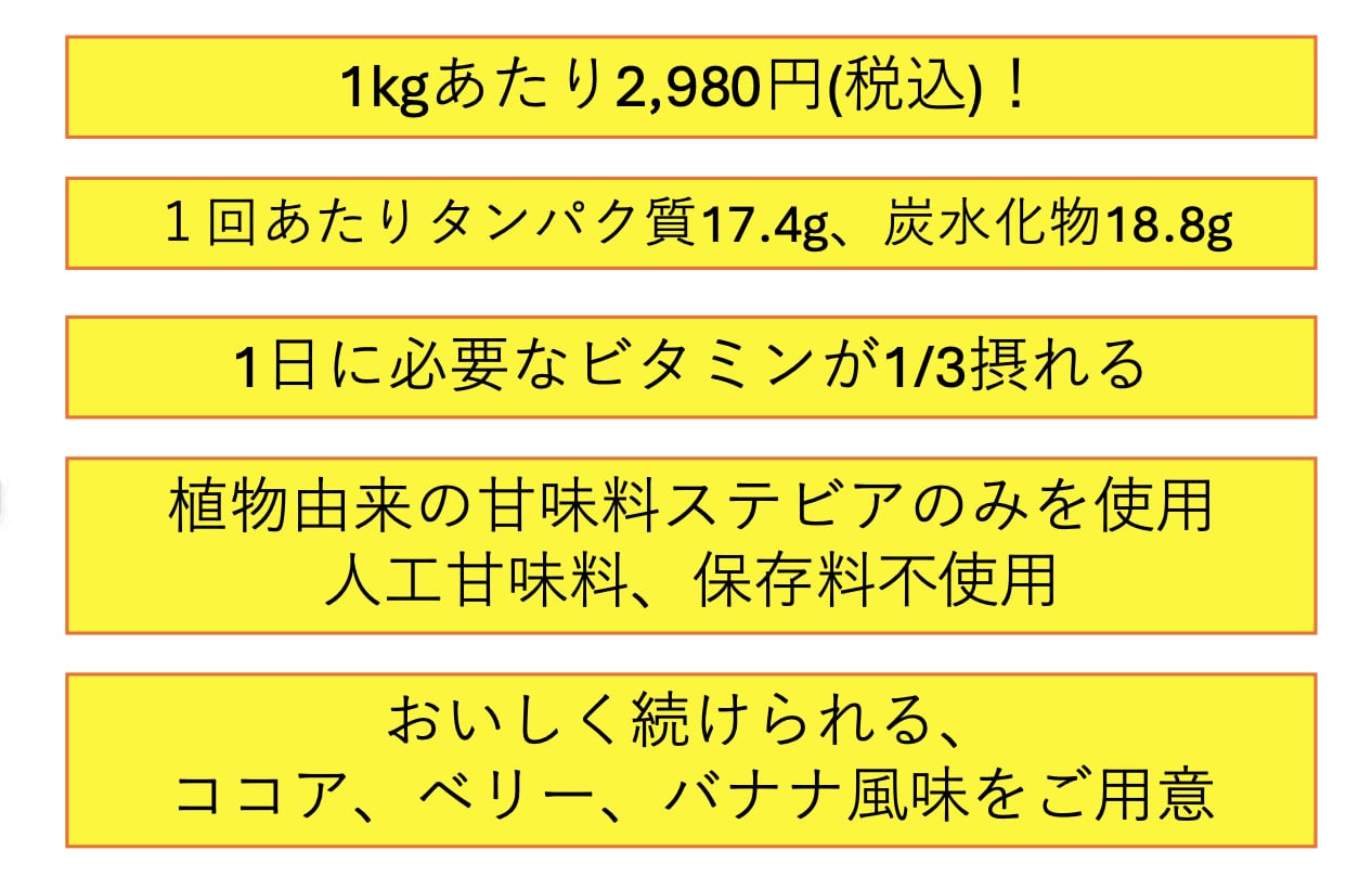 一般的なプロテインで言えば、パッケージやシール、広告費等です。それらを省き誕生し